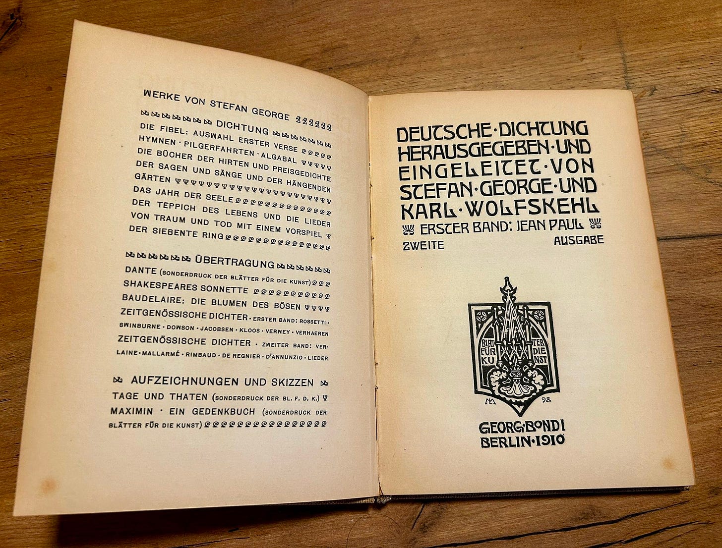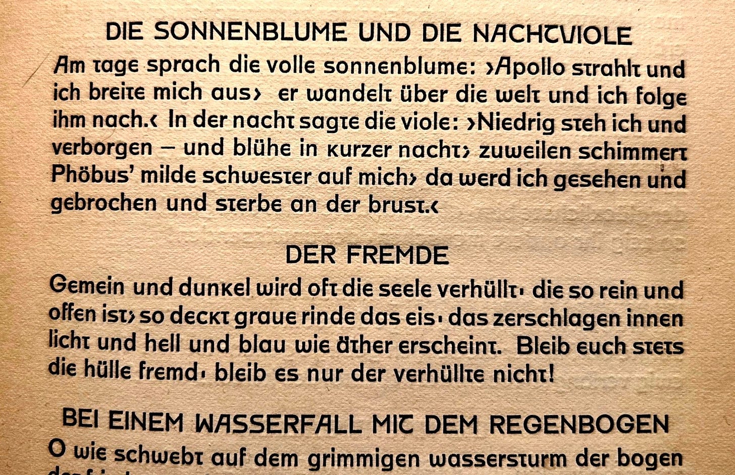 The book itself is a beautiful object, befitting Stefan George’s editorial involvement, and designed in the German Art-Nouveau style called Jugendstil. The body text is quite modern, even futuristic (or retro-futuristic) looking; its angular, sans-serif font reminds me of science-fiction posters from the 70s or 80s, especially the punctuation, which is wild considering that Fraktur, the Germanic blackletter script, was still quite commonly used in 1910. It might not meet contemporary standards of legibility, but compared to its contemporaries, the book is quite easy to read.