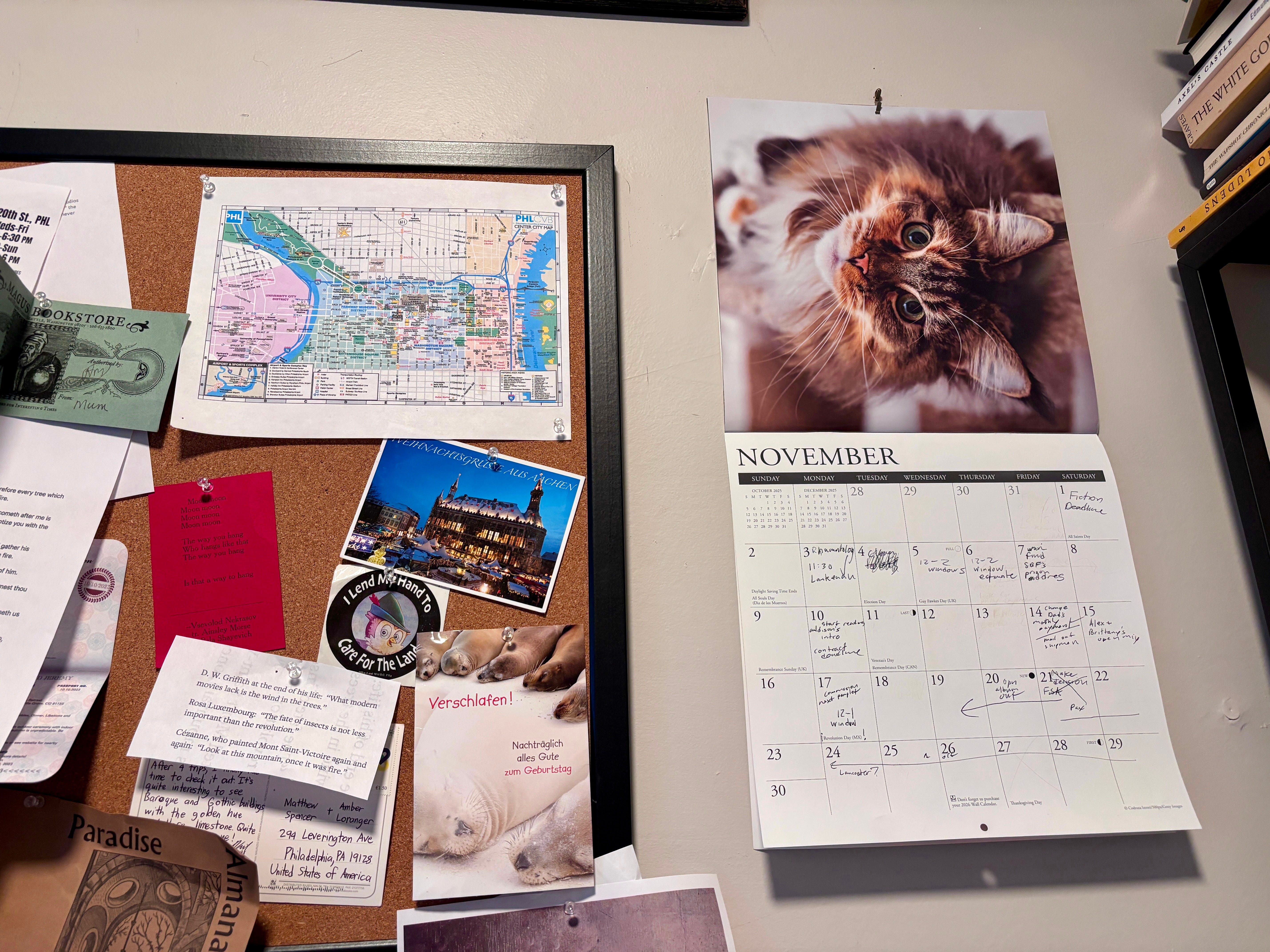 It’s November, firmly so, and time for replacing the old wall calendar. I have a great respect for calendars as a physical medium. Johann Peter Hebel wrote some of my favorite narrative prose in German for them, appending tales like an “An Unexpected Reunion” and “A Peculiar Ghost Story” to the usual index of days and months, tales about everyday people for everyday people—farmers, miners, butchers, bakers, and the like; Hebel’s subjects were his audience. I really like that.