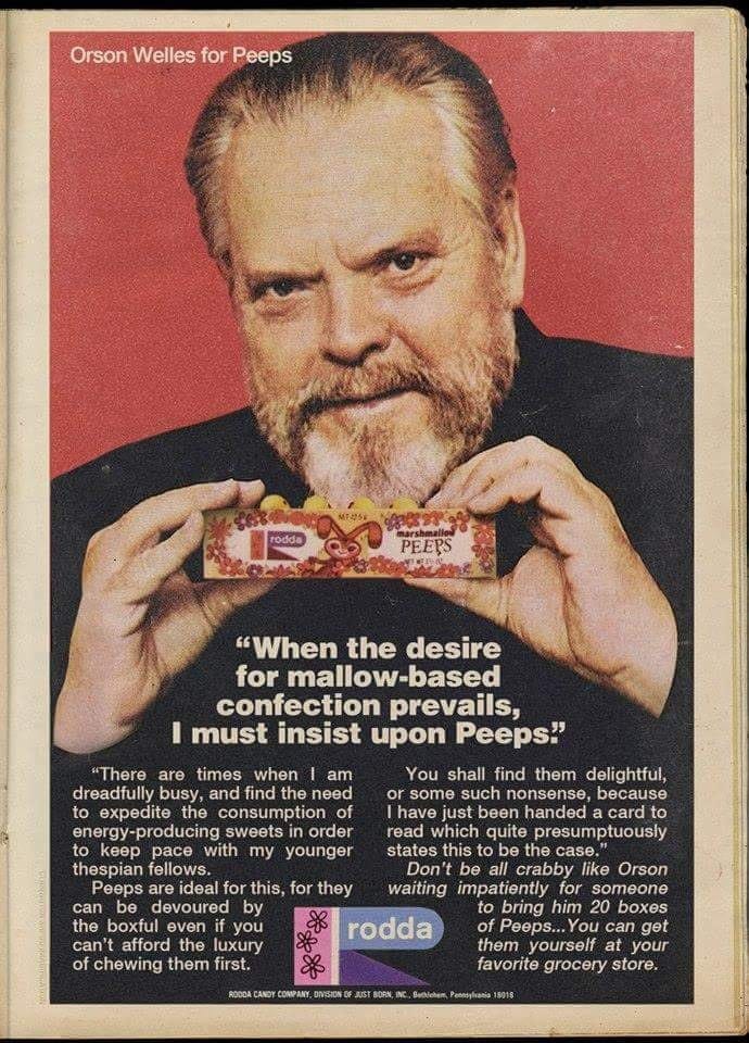 It is the confection insisted upon, those little mallow-based springtide confections—baby sheep, baby chickens, baby bunnies—insisted upon but only briefly, round about Holy Week, being scarce other times—not precious but scarce. They provide a kind of grimaced enjoyment, devoured by the boxful. They nest in pastel wicker baskets, between chocolate malted or marzipan eggs, strands of cellophane grass completing the enbowerment. This is the main tableau on offer, indoors and outdoors: generation, nature naturing, symbolically at least.